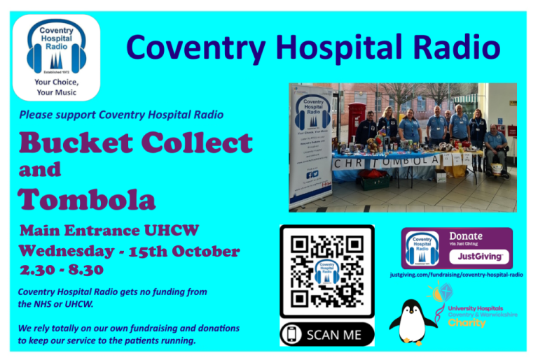 We rely totally on fundraising and donations to keep our service to the patients running throughout the year. If you would like to help Coventry Hospital Radio please select our JustGiving Icon, scan our QR Code or come along and visit us at one of our fundraising events.